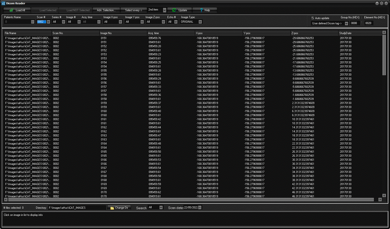 DICOM reader dialog scans the selected folder (including subfolder) for all