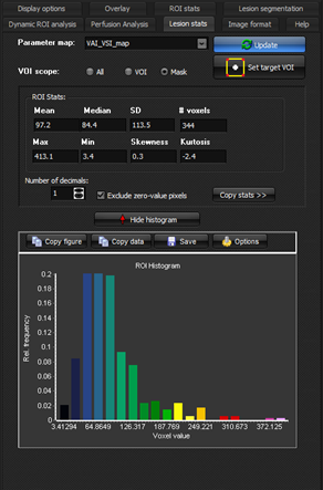 Figure 1: Display of statistical data and histogram for tumor